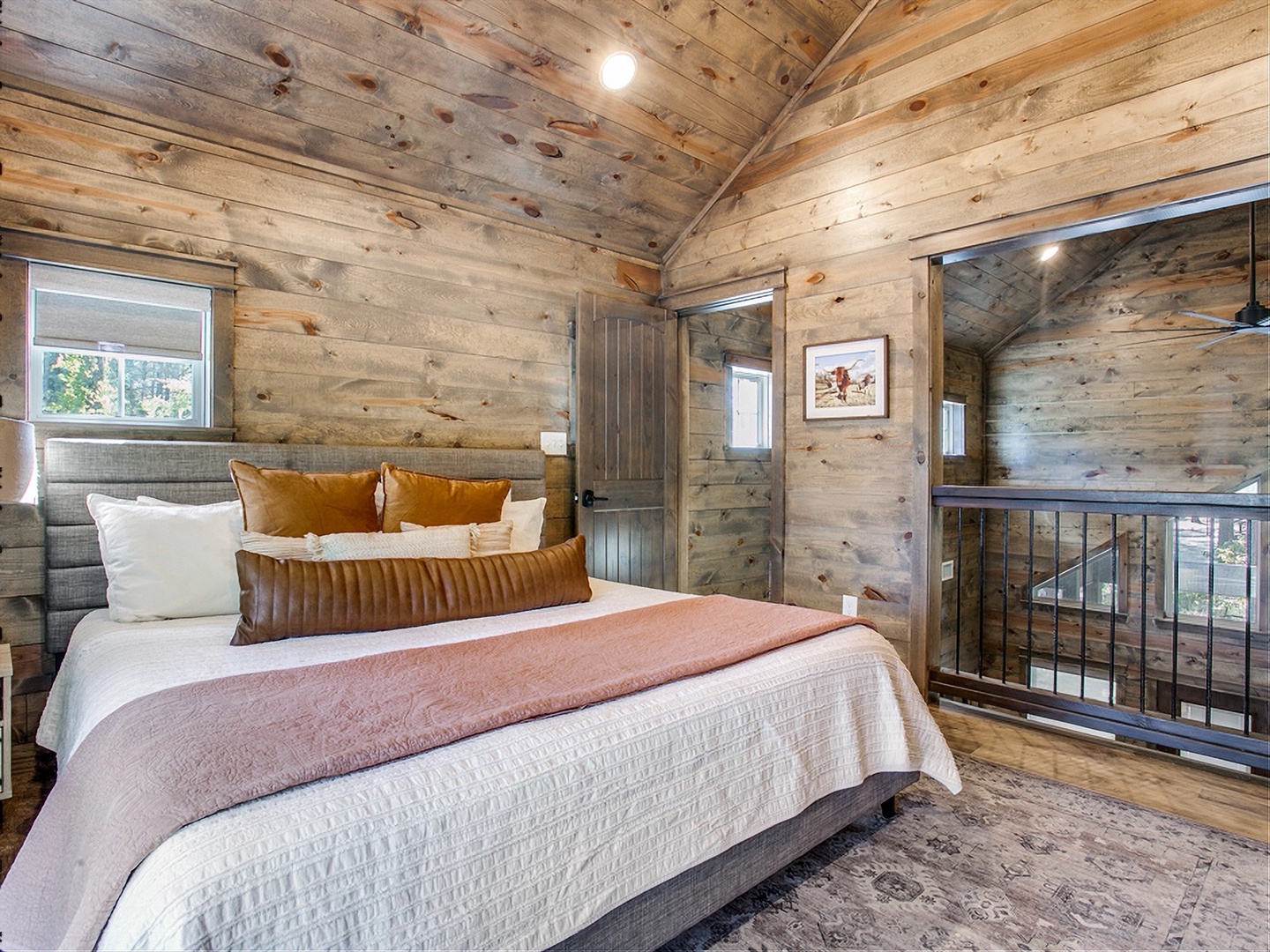 The upstairs loft area has doors for privacy. In the loft area there is a king bed, the loft viewing area has a pull door for privacy in the room, and a closet for storage of personal belongings. The attached bath has a single vanity, toilet and shower/tub combo.