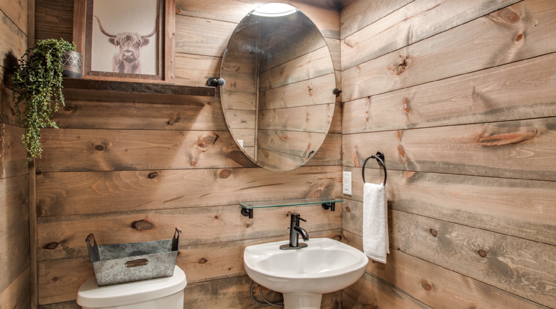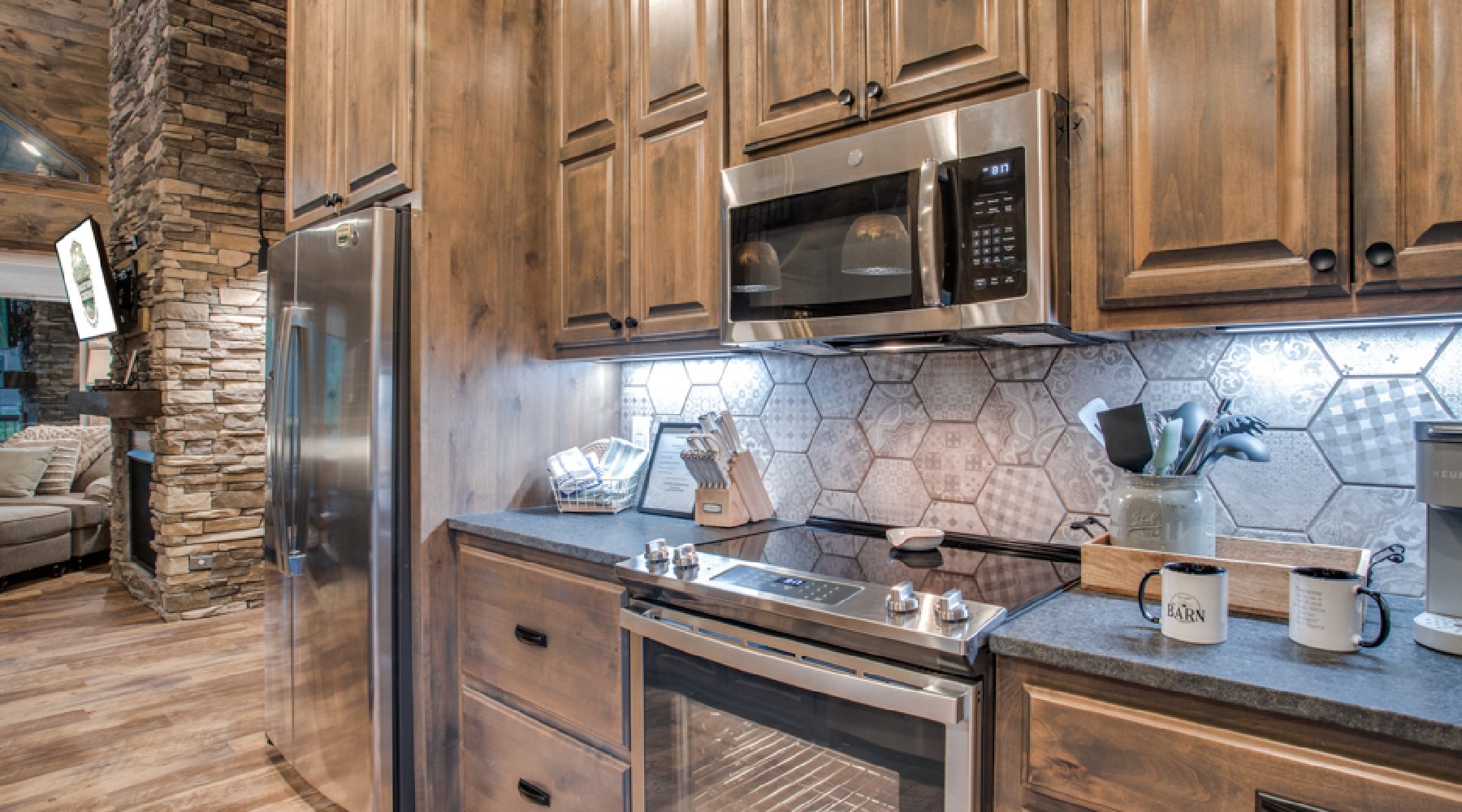 The Barn At Broken Bow has a fully equipped kitchen with stainless steel appliances. These include side by side refrigerator, dishwasher, glass top range/oven, microwave and a double bay stainless steel sink. The cabinets are stocked with dishes, eating utensils, glasses, pots and pans, bakeware, cooking utensils, a K-cup (pods not provided) and regular automatic coffee pot (coffee and filters provided). Seating for dining can be accommodated at the island bar with stools for six. There is a powder room off of the kitchen.