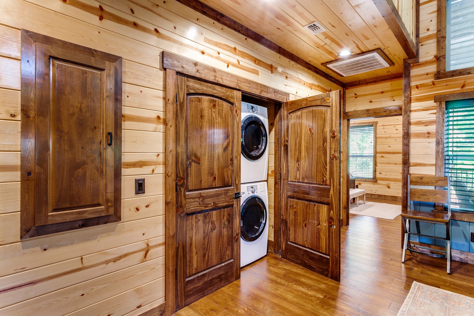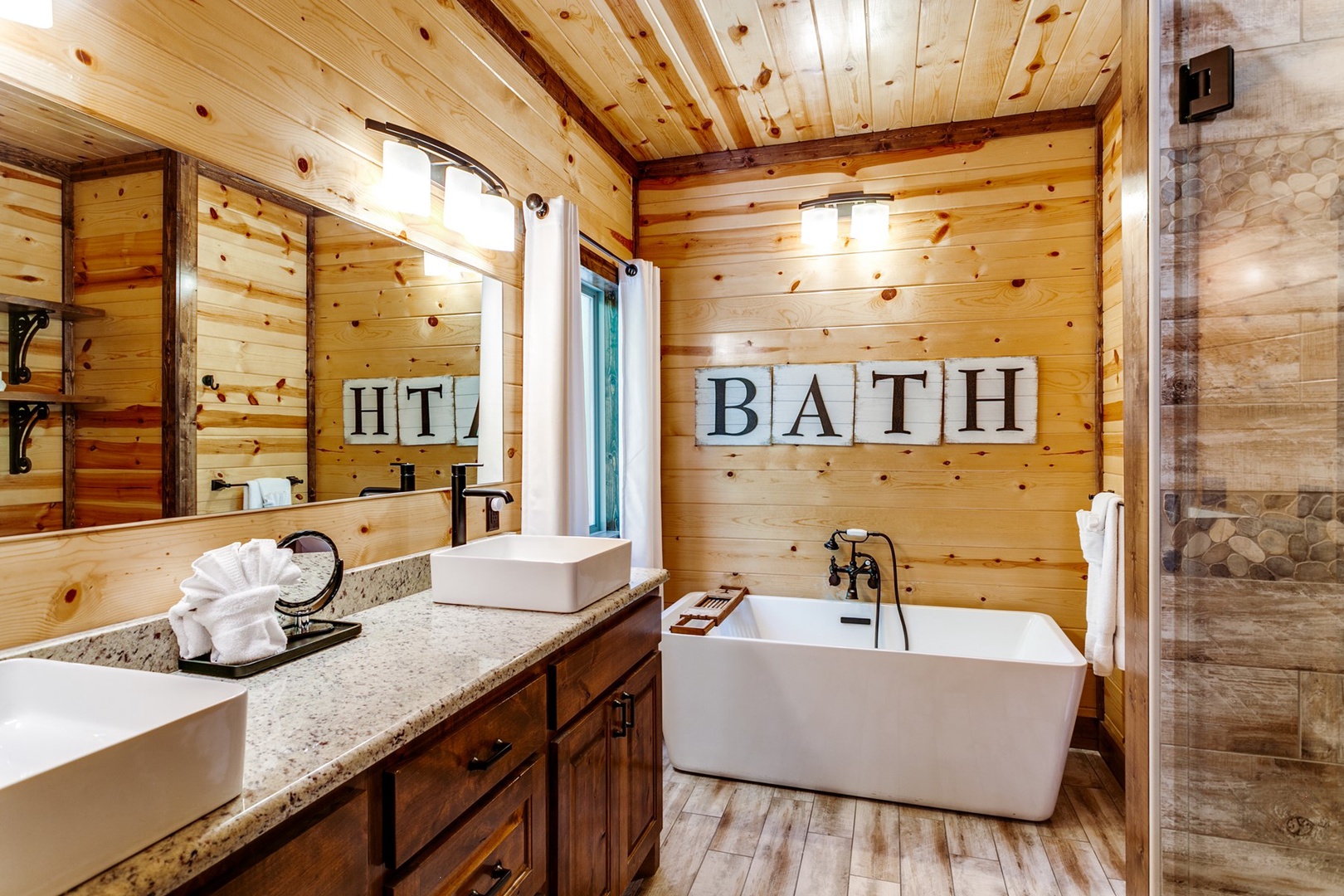 In the main living space, there is a half bath and laundry closet. The Good Life has two bedroom suites with king beds and closets. The front bedroom has a memory foam mattress and there is a soaking tub as well as a shower in the bath. The second bedroom has an innerspring mattress, a shower in bath and a private entrance to the back deck.