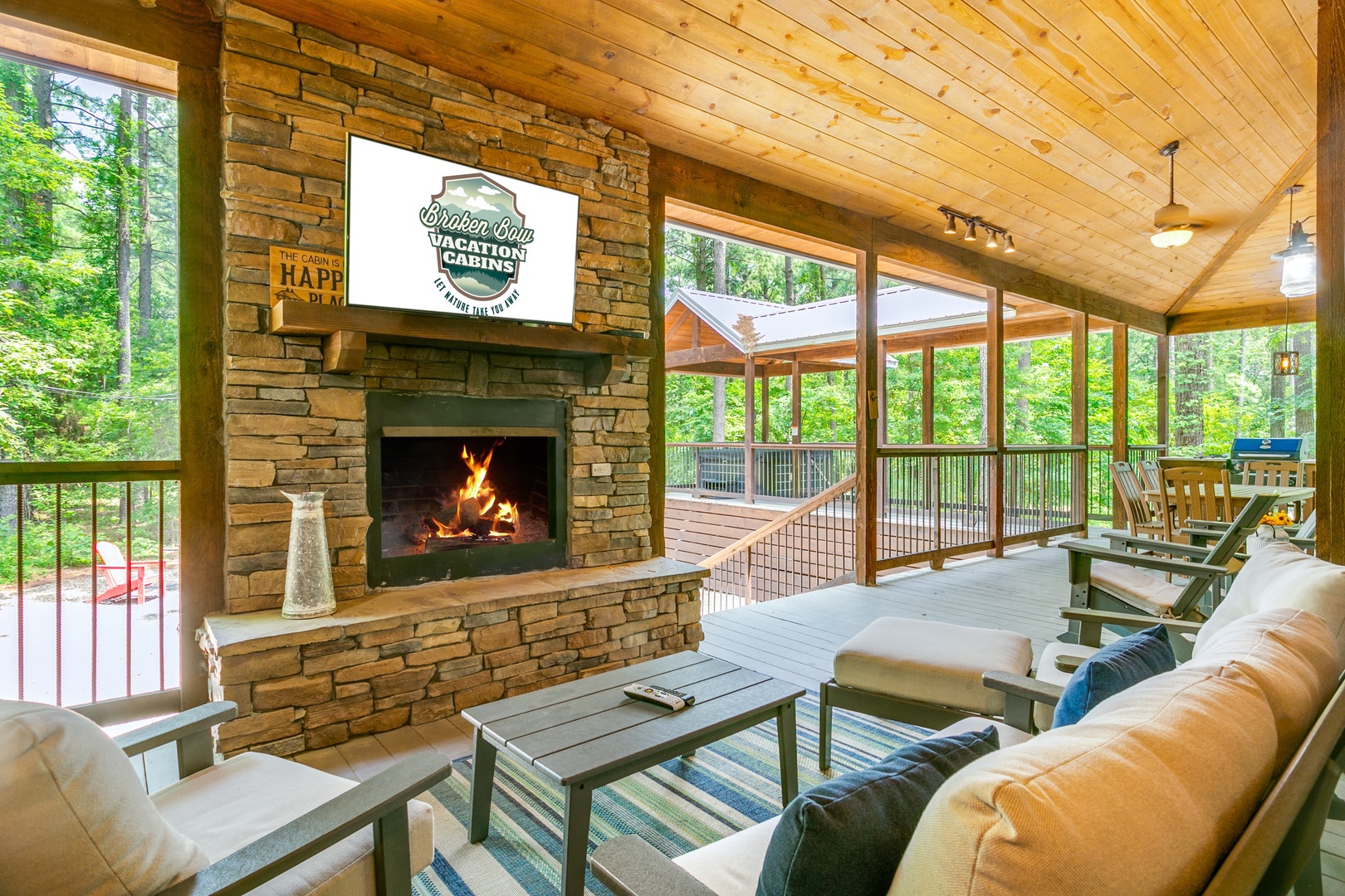 Outside, relax in the comfortable seating in front of a gas log fireplace with and easy on timer and switch (seasonal Oct 15th- April 15th), a propane grill (propane provided), a HDTV with DirecTv (PPV not available) and a hot tub located in a alcove. On the gravel yard, enjoy the firepit, horseshoe pit, corn hole game and tetherball. The back deck also has two adirondack rocking chairs and an outdoor dining table.
